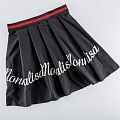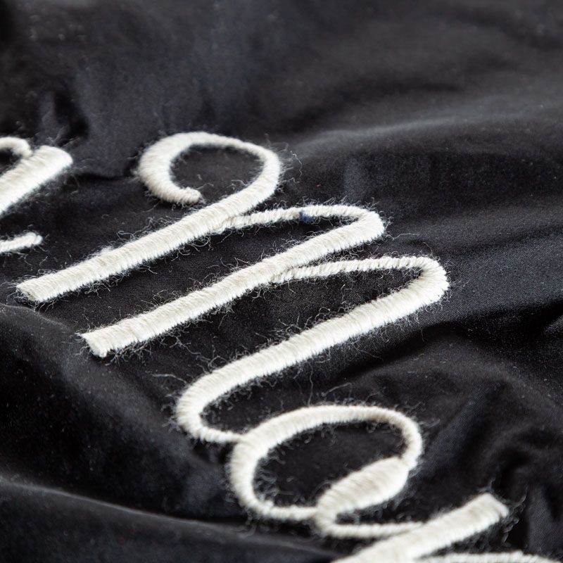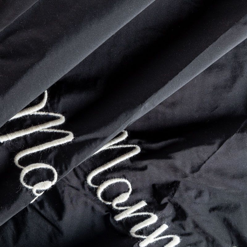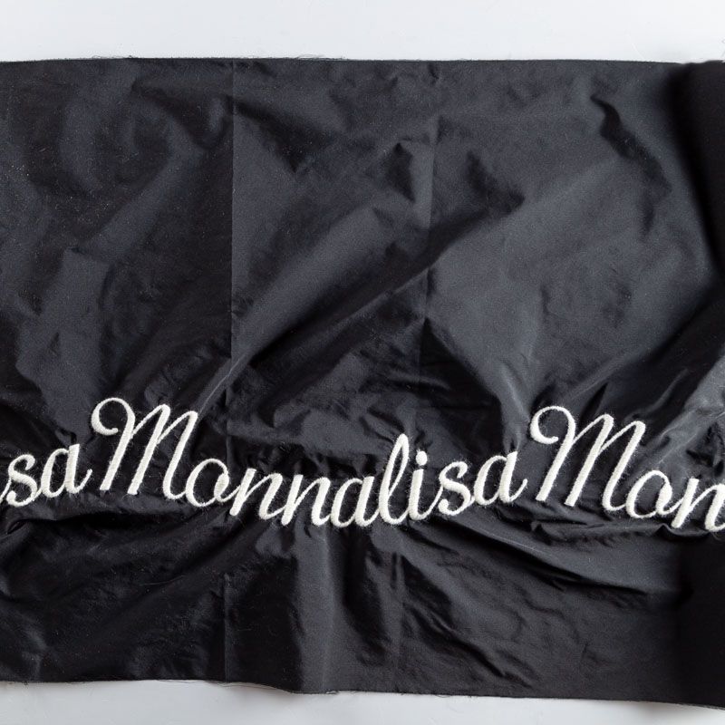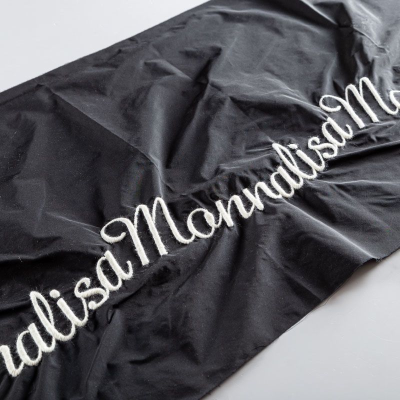 Вышивка на тафте Monnalisa высочайшего качества. Тафта черного цвета тонкая, но плотная, отлично держит форму, драпируется красивыми жесткими складками и загибами. Фактура гладкая, с матовым блеском. Богатая объемная вышивка логотипа бренда выполнена шерстяной белой нитью идеально. Подойдет как для самостоятельного изделия: юбка, ярусное платье, плащ, парка, так и для декорирования любых изделий: вставка в рукав, оборка, кокетка и т.д.