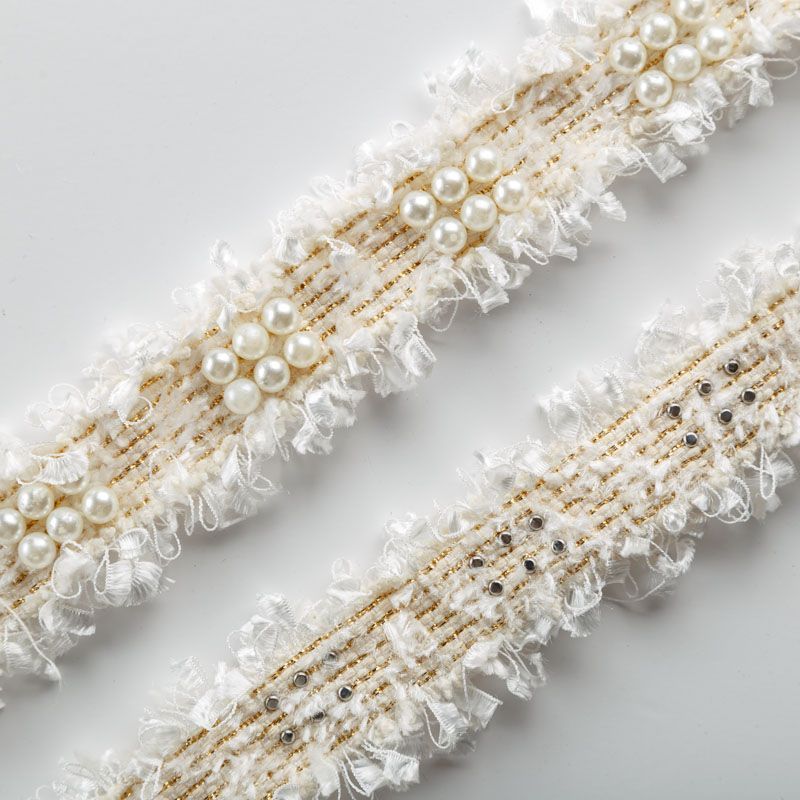 Тесьма декоративная выполнена из бархатистых нитей, прошита люрексом и украшена жемчужными бусинами. Бусины надежно закреплены на тесьме. Подойдет для отделки одежды из твида, букле в стиле Шанель.