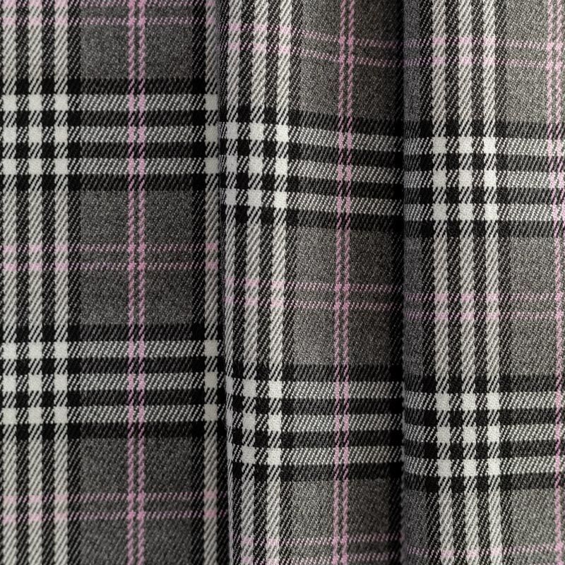Ткань средней плотности, мягкая и приятная на ощупь, немного тянется, формоустойчива, хорошо драпируется и образует мягкие складки. Сочетание линий черного, белого и розового цветов на спокойном сером фоне образует сложную красивую клетку тартан. Ткань отлично подойдет на костюмы, юбки, брюки, платья, жакеты.