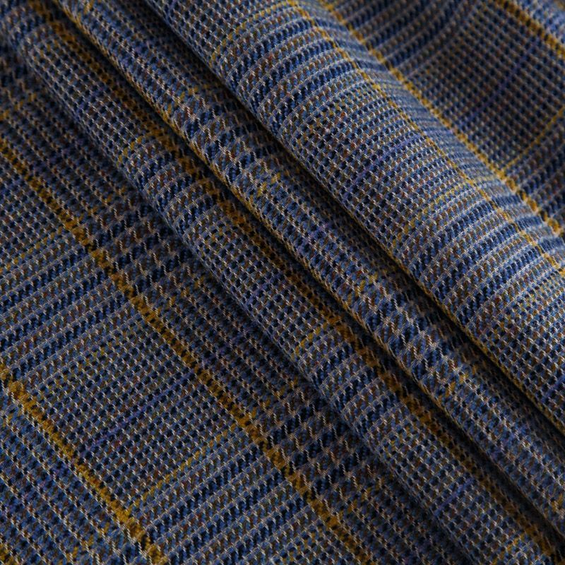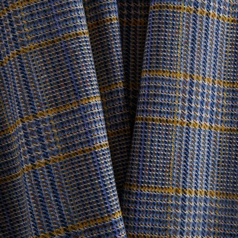Итальянская костюмно-плательная смесовая шерсть средней плотности, не сухая, пластичная, приятная на ощупь, формоустойчива, не мнется, хорошо драпируется. Красивая клетка тартан образована за счет сочетания полос синего, голубого, желтого и песочного оттенков. Ткань отлично подойдет на костюм, жилет, жакет, легкое пальто, юбку, брюки, плате, сарафан, шорты.