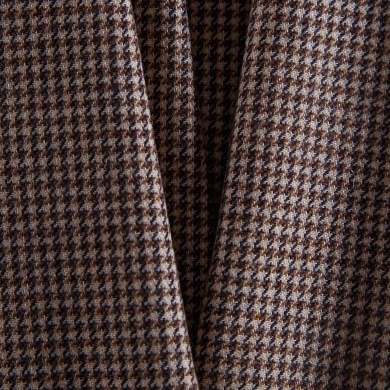 Итальянская костюмно-плательная шерсть средней плотности в бежевом оттенке в мелкую куриную лапку. Ткань не сухая, пластичная, приятная на ощупь, почти не мнется, хорошо драпируется. Ткань отлично подойдет на костюм, жилет, жакет, легкое пальто, юбку, брюки, платье, сарафан, шорты.