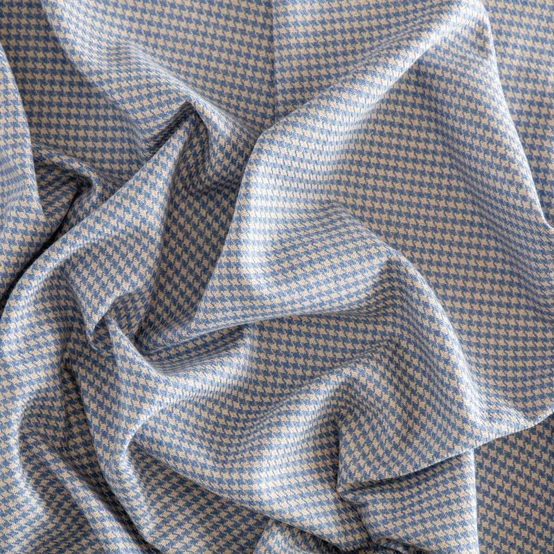 Костюмная ткань с уже классическим узором пье-де-пуль (гусиная лапка) песочно-голубого цвета. Рисунок образован за счёт жаккардового переплетения нитей. Материал мягкий, плотный, благодаря эластану изделия идеально сядут по фигуре и будут очень комфортные. Рекомендуем для пошива костюма, жакета, шорт или юбки.