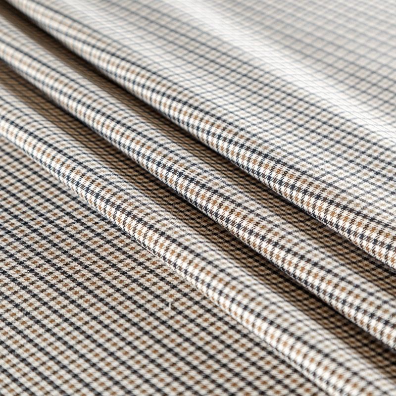 Костюмно-плательная поливискоза в бежевом оттенке в мелкую клетку. Ткань пластичная, очень приятная на ощупь, драпируется в слегка держащие форму складки. Подойдет для всех видов изделий - платьев, сарафанов, модных жакетов, жилетов, брючных и юбочных костюмов, кюлотов, брюк-палаццо, шорт, юбок различных фасонов.