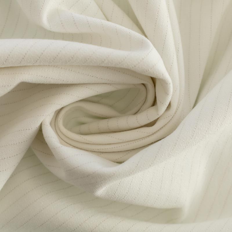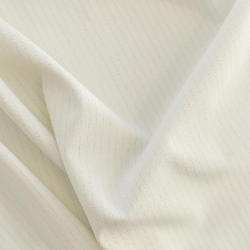 Достаточно плотная костюмно-плательная ткань, мягкая и приятная на ощупь, немного тянется, формоустойчива, хорошо драпируется и образует мягкие складки.  Элегантный молочный цвет ткани украшает тончайшая золотистая люрексная вертикальная полоска. Ткань отлично подойдет на костюмы, юбки, брюки-палацио, платья, жакеты.