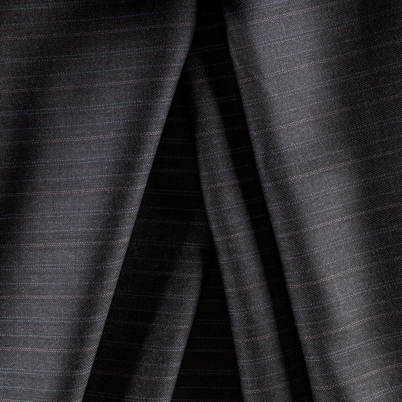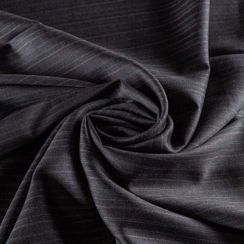 Костюмно-плательная ткань средней плотности, немного суховата, приятная на ощупь. На темно-сером фоне чередующиеся по цвету очень тонкие полоски, направление - вдоль кромки. Прекрасно подойдет для пошива брюк-палацио, жакета, платья по фигуре, сарафана, классического мужского или женского костюма.