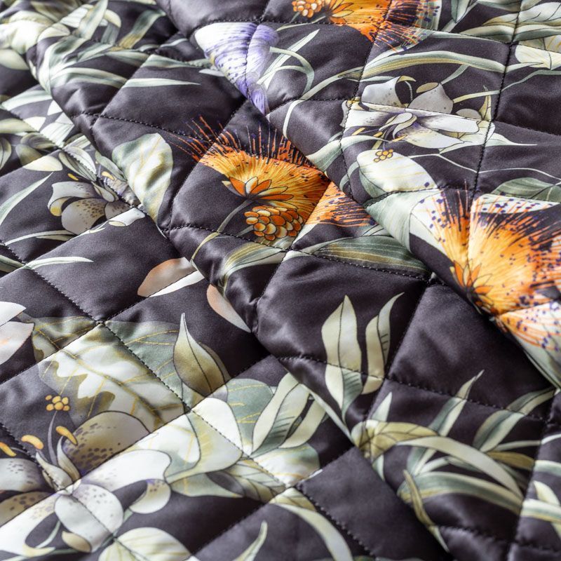 Трехслойная итальянская курточная ткань черного цвета с ярким цветочным принтом, простеганная не крупными ромбами размером 3х3 см. Нижний слой черного цвета, заменяет подклад, средний слой - синтепон, верхний слой - красочный матовый полиэстер, напоминающий болонь. Ткань легкая, пластичная, хорошо драпируется. Прекрасно подойдет для  пошива легких пальто, курток, бомберов, жилетов, накидок-кейпов, объемных сумок, одежды для домашних питомцев, туристического снаряжения.