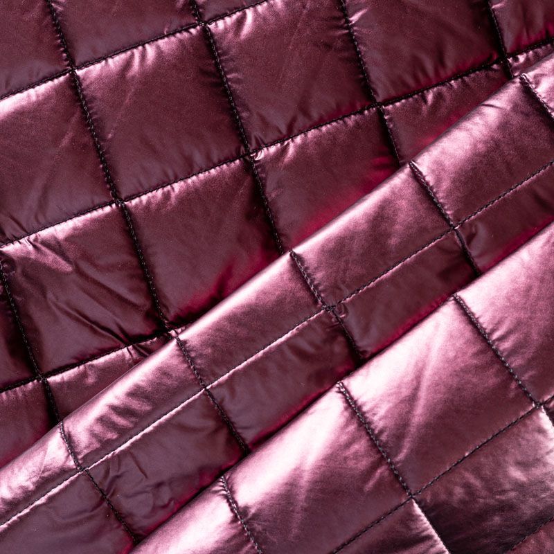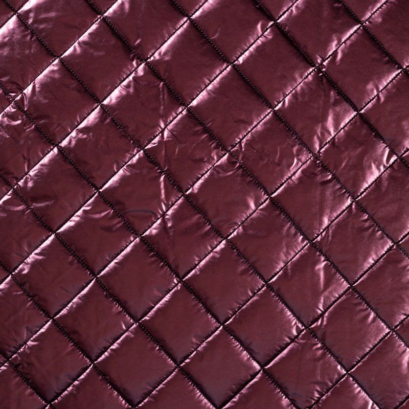 Трехслойная итальянская курточная ткань красивого сливового оттенка с легким эффектом металлик, простеганная не крупными ромбами размером 3х3 см. Нижний, черного цвета, заменяет подклад и верхний слой - полиэстер, по качеству напоминает болонь, между ними синтепон. Ткань легкая, пластичная, хорошо драпируется. Прекрасно подойдет для  пошива легких пальто, курток, бомберов, жилетов, накидок-кейпов, объемных сумок, одежды для домашних питомцев, туристического снаряжения.