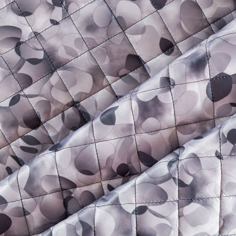 Трехслойная итальянская курточная ткань серого оттенка с абстрактным принтом, простеганная не крупными ромбами. Нижний, черного цвета, заменяет подклад и верхний слой - полиэстер, по качеству напоминает болонь, между ними синтепон. Ткань легкая, пластичная, хорошо драпируется. Прекрасно подойдет для пошива легких пальто, курток, бомберов, жилетов, накидок-кейпов, объемных сумок, одежды для домашних питомцев, туристического снаряжения.