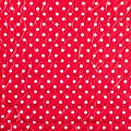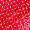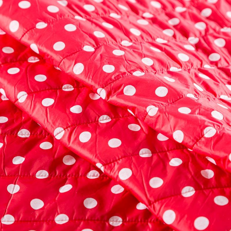 Двухслойная курточная ткань красного оттенка в белый горох, простеганная вертикальными линиями вдоль кромки. Нижний слой - синтепон, верхний - полиэстер, по качеству напоминает болонь. Очень мягкая и легкая, пластичная, хорошо драпируется. Прекрасно подойдет для пошива легких пальто, курток, жилетов, накидок-кейпов, объемных сумок.