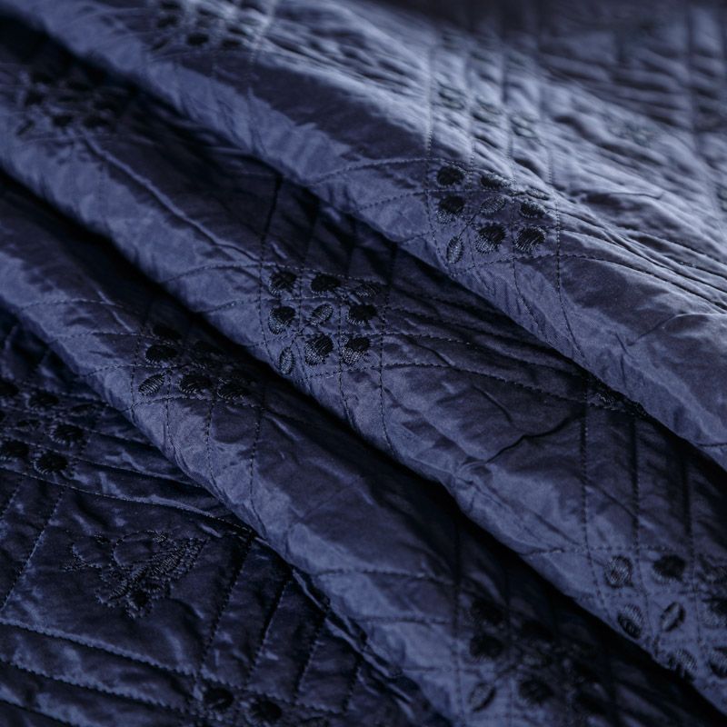 Двухслойная курточная ткань темно-синего оттенка, с геометрической стежкой и элементами вышивки нитками в тон полотну. Нижний слой - синтепон, верхний -  полиэстер, по качеству напоминает болонь. Ткань легкая, пластичная, хорошо драпируется. Прекрасно подойдет для  пошива пальто, курток, жилетов, накидок-кейпов, объемных сумок, одежды для домашних питомцев, туристического снаряжения.
