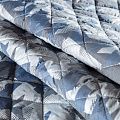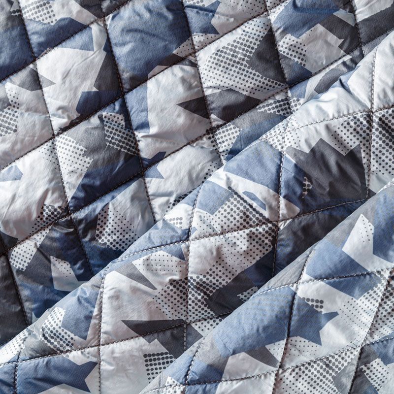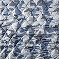 Двухслойная курточная ткань серебристого цвета с геометрическим принтом в сине-черной гамме, простеганная не крупными ромбами размером 4х4 см. Нижний слой - синтепон, верхний - полиэстер, по качеству напоминает болонь. Очень мягкая и легкая, пластичная, хорошо драпируется. Прекрасно подойдет для  пошива легких пальто, курток, жилетов, накидок-кейпов, объемных сумок.