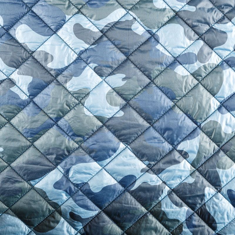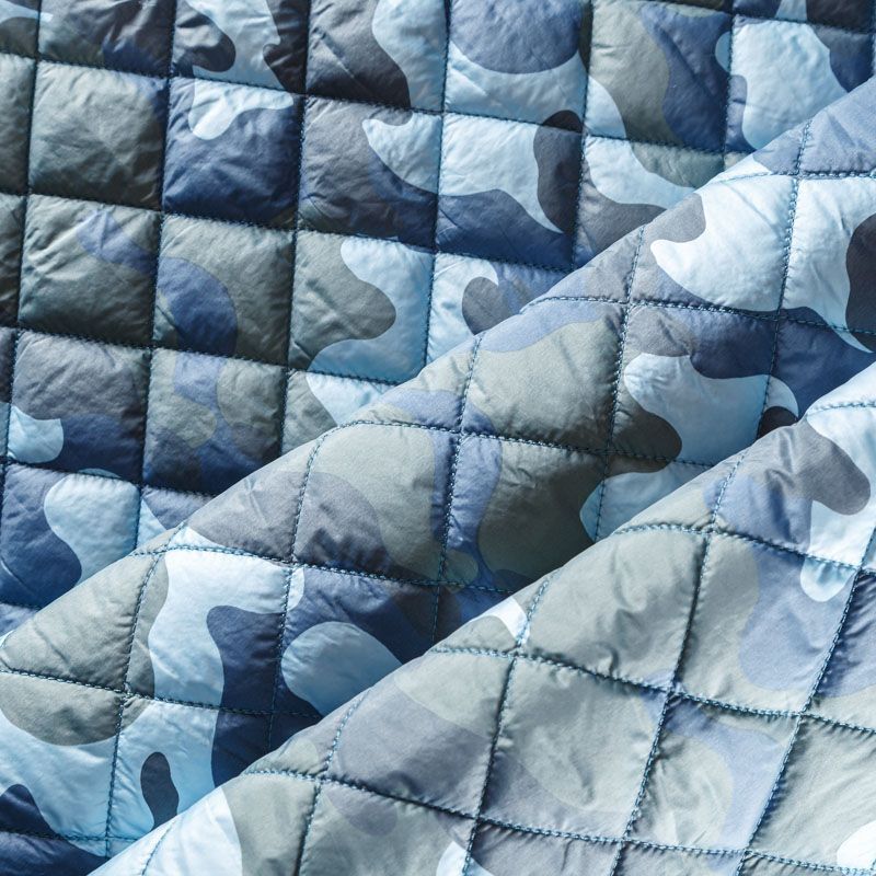 Двухслойная курточная ткань голубого оттенка с оригинальным камуфлированным принтом, простеганная не крупными ромбами. Нижний слой - синтепон, верхний - полиэстер, по качеству напоминает болонь. Очень мягкая и легкая, пластичная, хорошо драпируется. Прекрасно подойдет для  пошива легких пальто, курток, жилетов, накидок-кейпов, объемных сумок.