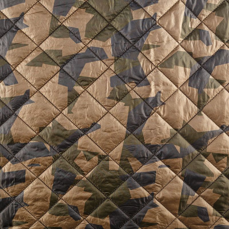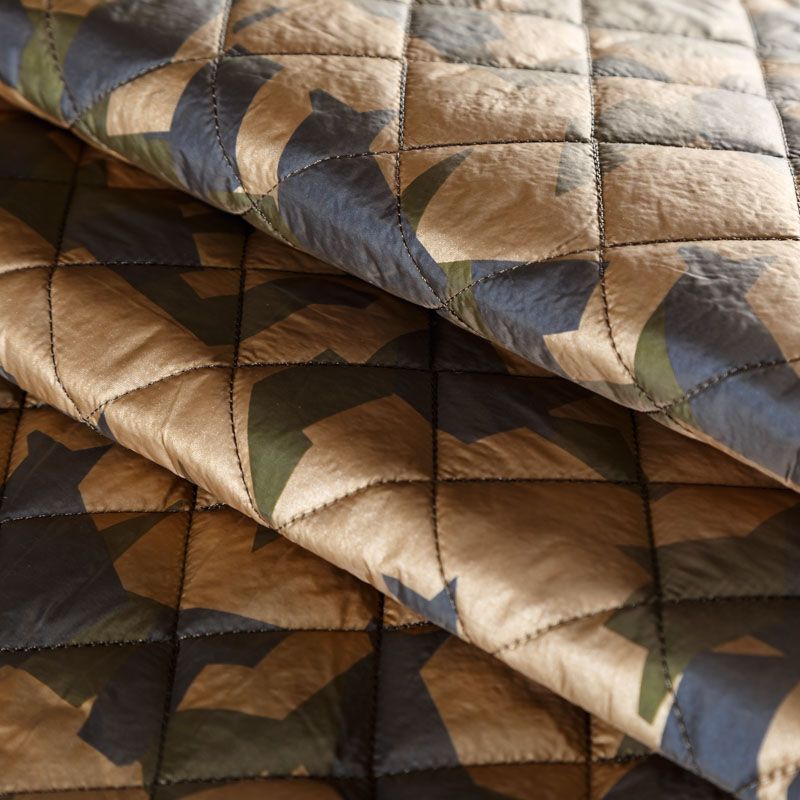 Двухслойная курточная ткань золотистого цвета с геометрическим принтом в зелено-черной гамме, простеганная не крупными ромбами размером 4х4 см. Нижний слой - синтепон, верхний - полиэстер, по качеству напоминает болонь. Очень мягкая и легкая, пластичная, хорошо драпируется. Прекрасно подойдет для пошива легких пальто, курток, жилетов, накидок-кейпов, объемных сумок.