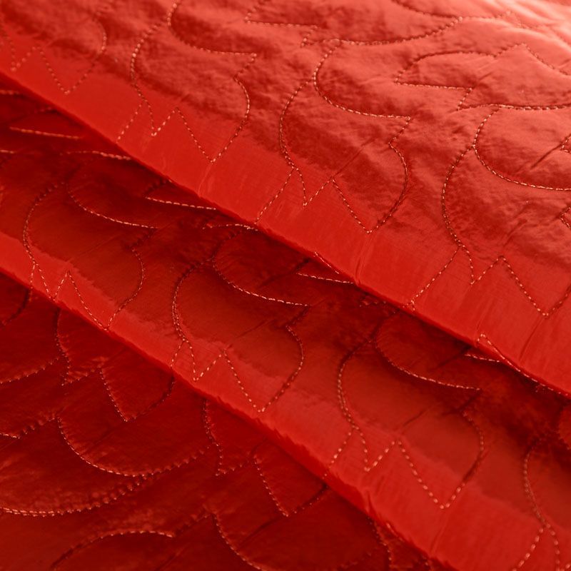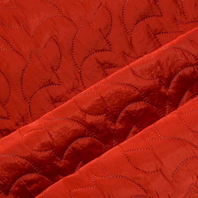 Двухслойная курточная ткань красно-оранжевого оттенка, простеганная фигурной вышивкой нитками в тон. Нижний слой - синтепон, верхний - плотный матовый полиэстер. Очень мягкая и легкая, пластичная, хорошо драпируется. Прекрасно подойдет для  пошива легких пальто, курток, жилетов, накидок-кейпов, объемных сумок.