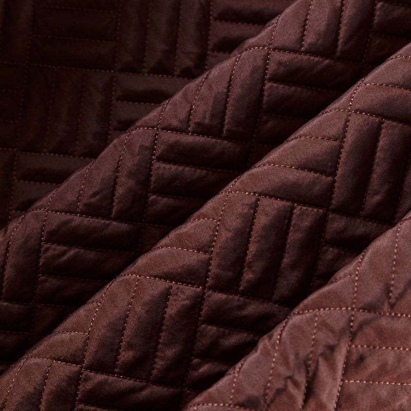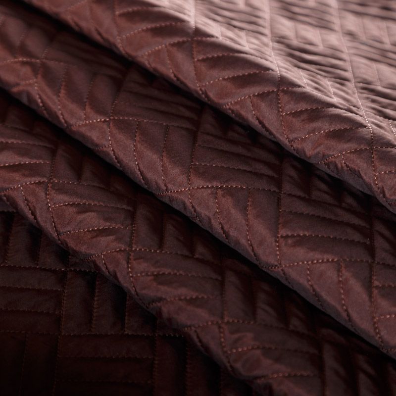 Двухслойная курточная ткань коричневого оттенка, с геометрической стежкой нитками в тон полотну. Нижний слой - синтепон, верхний -  полиэстер, по качеству напоминает болонь. Ткань легкая, пластичная, хорошо драпируется. Прекрасно подойдет для  пошива пальто, курток, жилетов, накидок-кейпов, объемных сумок, одежды для домашних питомцев, туристического снаряжения.