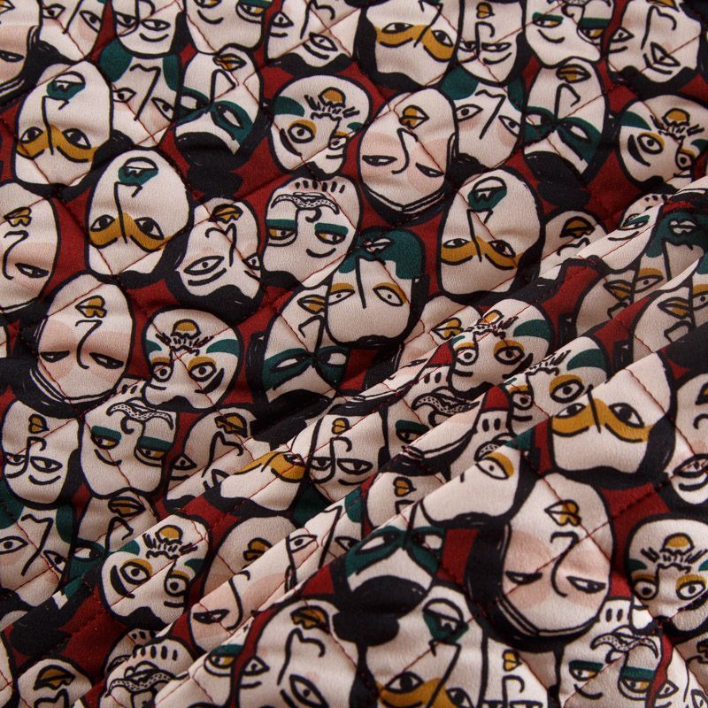 Итальянская трехслойная курточная ткань вишневого оттенка цвета с абстрактным принтом, простеганная ромбами. Нижний слой - гладкий матовый полиэстер красного цвета, средний слой - синтепон, верхний - принтованный креп-шифон. Очень мягкая и легкая, пластичная, хорошо драпируется. Прекрасно подойдет для  пошива легких пальто, бомберов, парки, курток, жилетов, накидок-кейпов, объемных сумок.