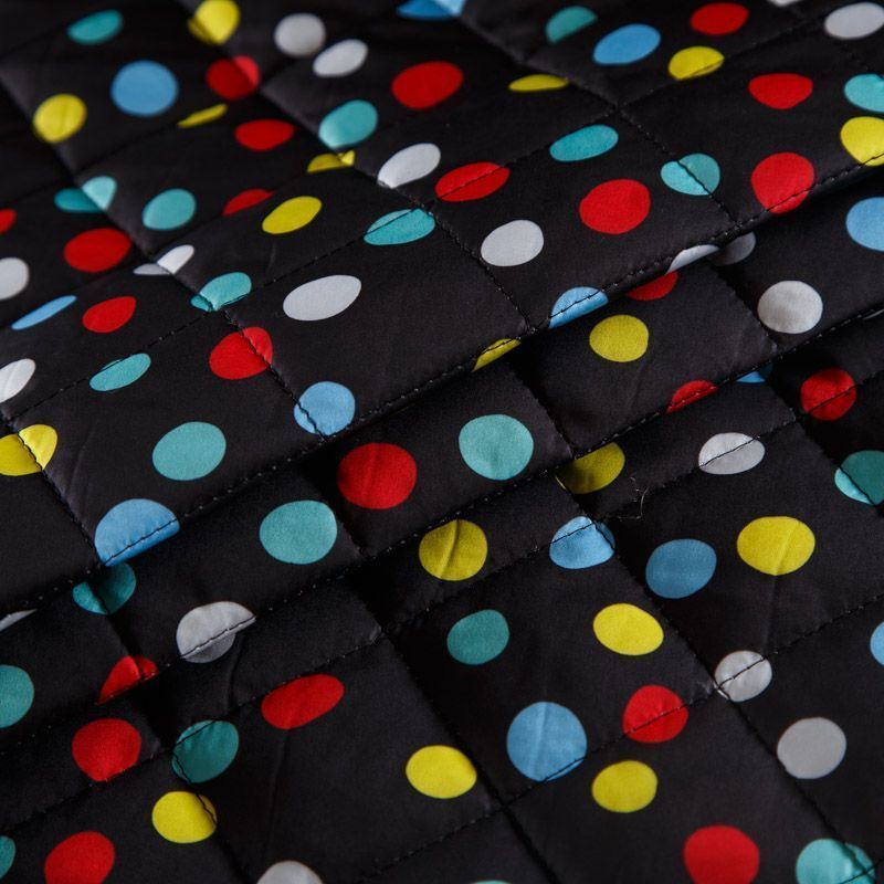 Итальянская трехслойная курточная ткань черного цвета с ярким принтом, простеганная ромбами 5*5 см. Нижний слой - подкладочная ткань черного цвета, средний слой - синтепон, верхний - матовый гладкий полиэстер. Очень мягкая и легкая, пластичная, хорошо драпируется. Прекрасно подойдет для  пошива легких пальто, бомберов, парки, курток, жилетов, накидок-кейпов, объемных сумок.