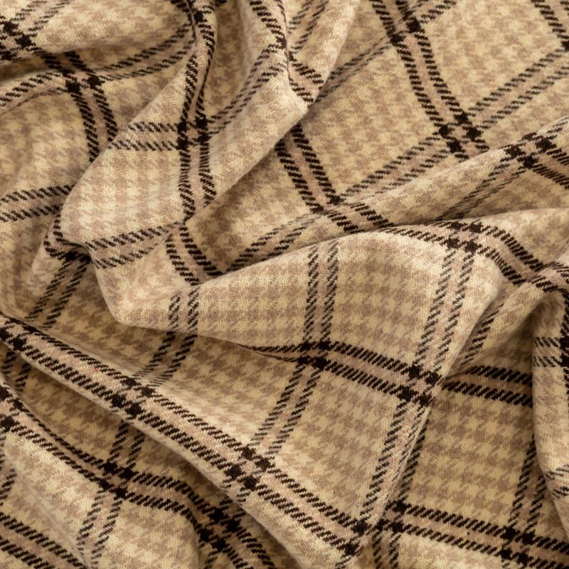 Стильная и элегантная пальтовая ткань с светлых тонах. Поверхность бархатистая, мягкая, очень приятная на ощупь, пластичная, мягко драпируется в складки, немного держит форму. Сочетание линий коричневого, карамельного оттенков и классического узора "гусиная лапка" образует сложную красивую клетку. Отлично подойдет для пошива пальто, теплых костюмов, юбки, шорт, жакета, кейпа, жилета.