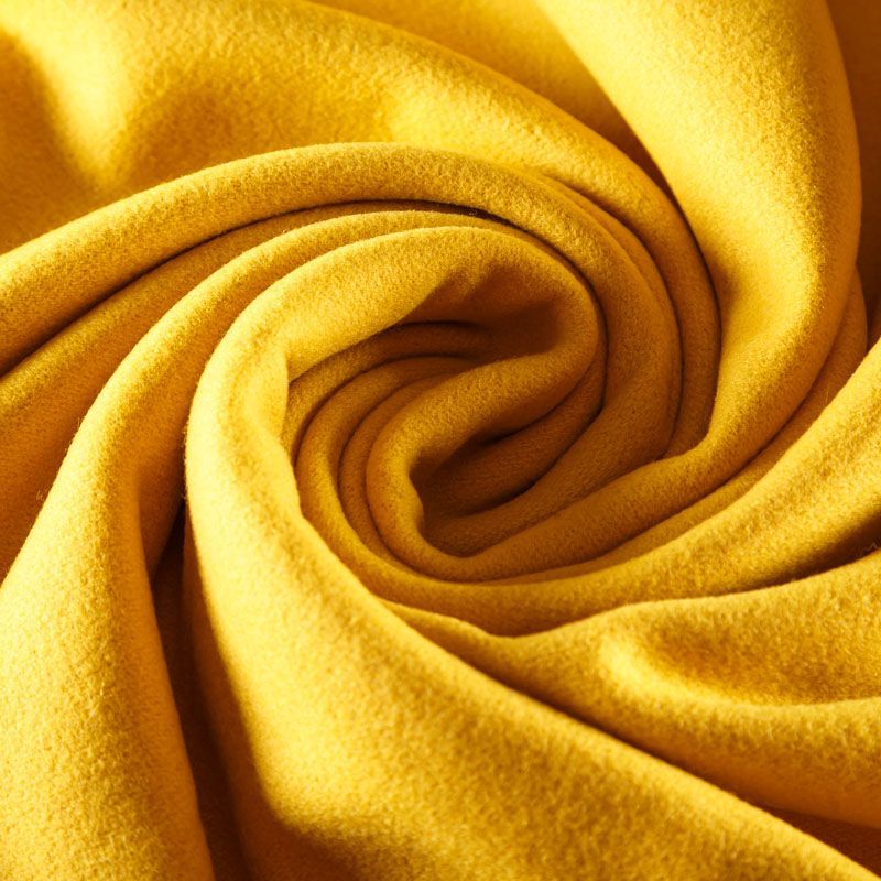 Пальтовая итальянская шерсть в красивом шафрановом оттенке. Ткань плотная, достаточно теплая, комфортная для одежды на сезон осень-зима. Полотно имеет короткий ворс. Мягкое и нежное на ощупь, не толстое и не тяжелое, хорошо держит форму. Прекрасно подойдет для пошива женских пальто, теплых костюмов, кейпов, мягких бомберов, жилетов и головных уборов.