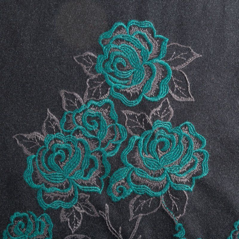 Пальтовая ткань из натуральной шерсти графитового оттенка с объемной цветочной вышивкой изумрудного цвета вдоль кромки,  для пошива изделия набирается объемом. Ткань хорошей плотности, отлично держит форму, не деформируется, приятная на ощупь. Прекрасно подойдет для пошива ориганального пальто, жилета, теплой юбки или жакета.