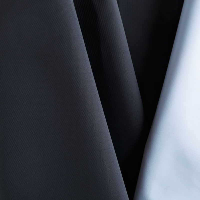 Плотная прочная плащевая ткань черного цвета с полиуретановым белым покрытием с изнаночной стороны. Поверхность ткани матовая, шероховатая на ощупь, слегка рельефная. Подходит для изготовления  плащей, курток, ветровок, бомберов, одежды для домашних питомцев, туристического снаряжения.