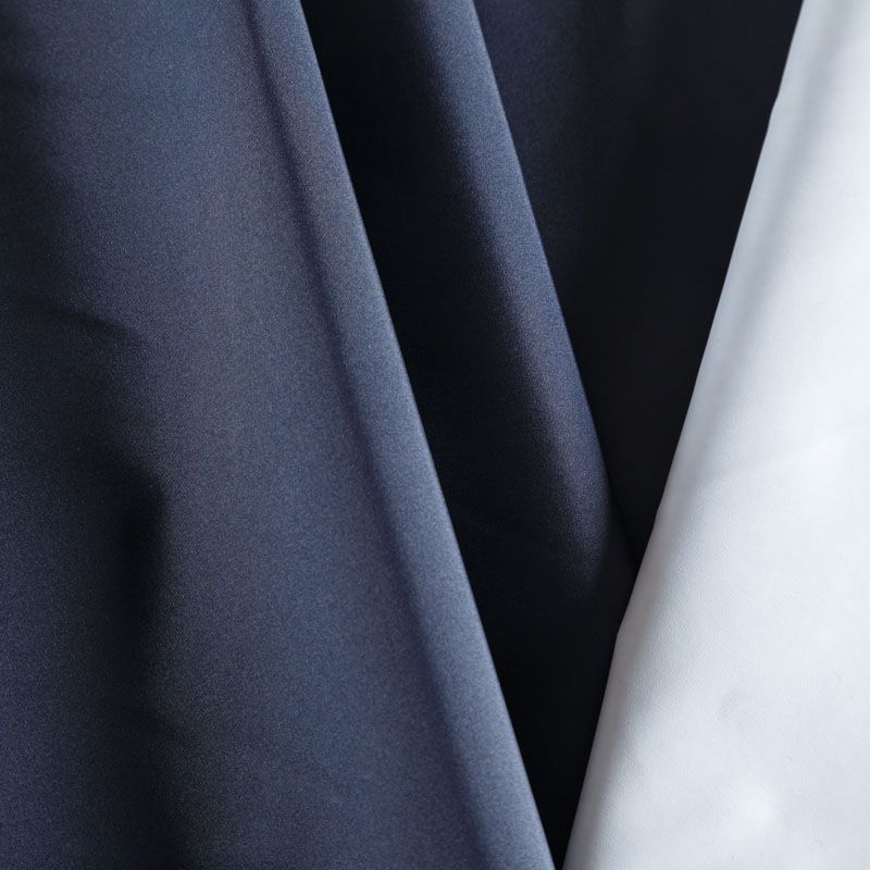 Плотная прочная плащевая ткань темно-синего цвета с полиуретановым белым покрытием с изнаночной стороны. Поверхность ткани матовая, ровная и гладкая. Подходит для изготовления  плащей, курток, ветровок, бомберов, одежды для домашних питомцев, туристического снаряжения.