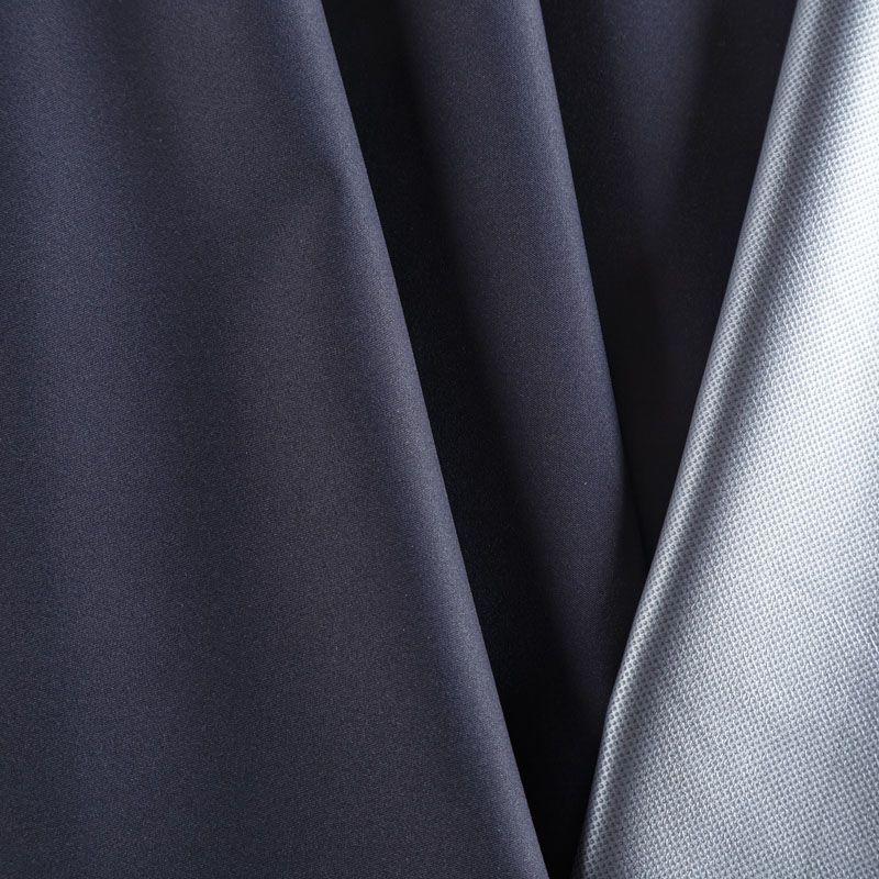Плотная прочная плащевая ткань черного цвета с перфорированным тонким покрытием с изнаночной стороны. Поверхность ткани матовая, ровная и гладкая. Подходит для изготовления  плащей, курток, ветровок, бомберов, одежды для домашних питомцев, туристического снаряжения.