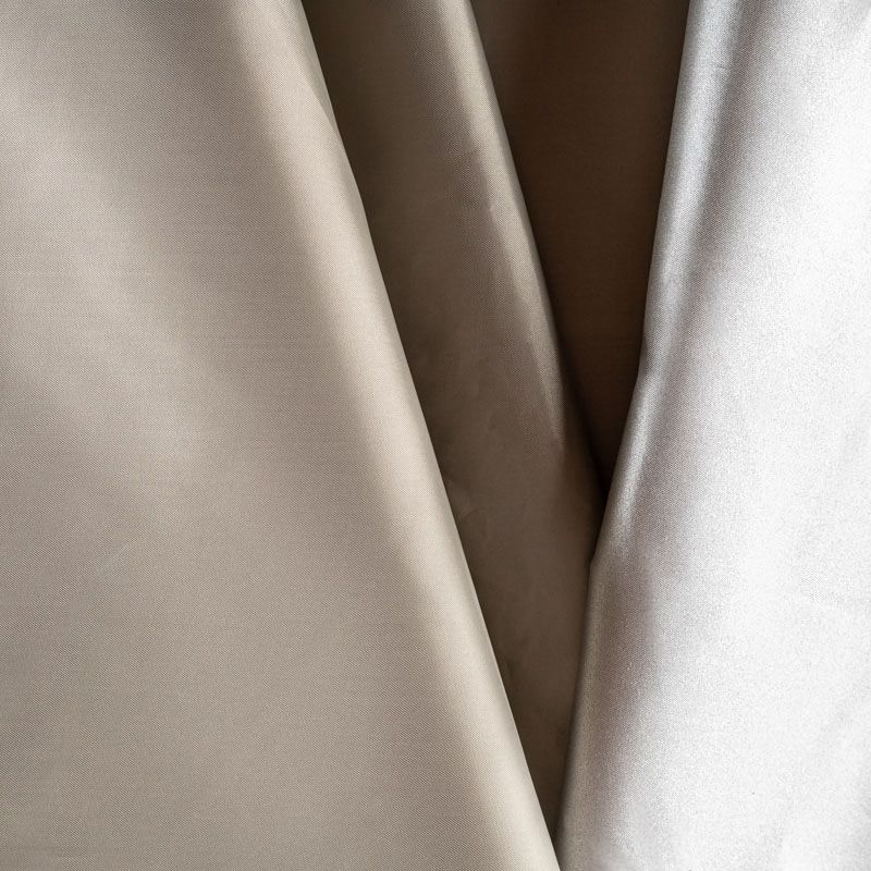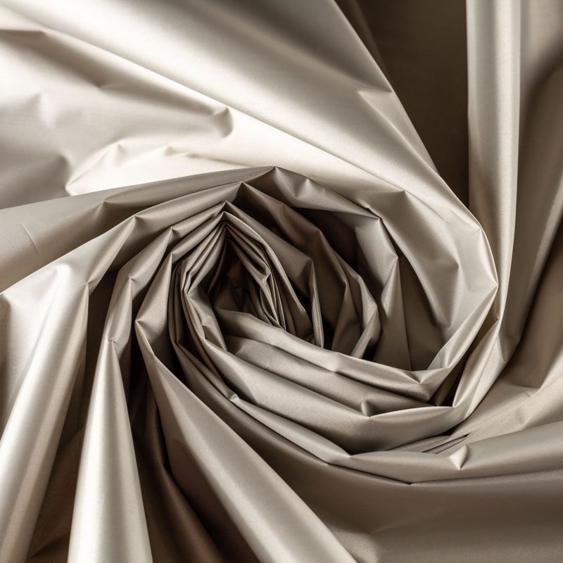 Это матовая, тонкая, гладкая, но очень прочная ткань с легким блеском. На ее изнаночную сторону нанесена пропитка серебристого цвета, за счет которой материал становится менее прозрачным, зато более яркого цвета. Шьют из нее куртки, ветровки, плащи и особенно она хороша для пуховиков: обработка такой пропиткой дает возможность отлично удерживать пух внутри изделия.
