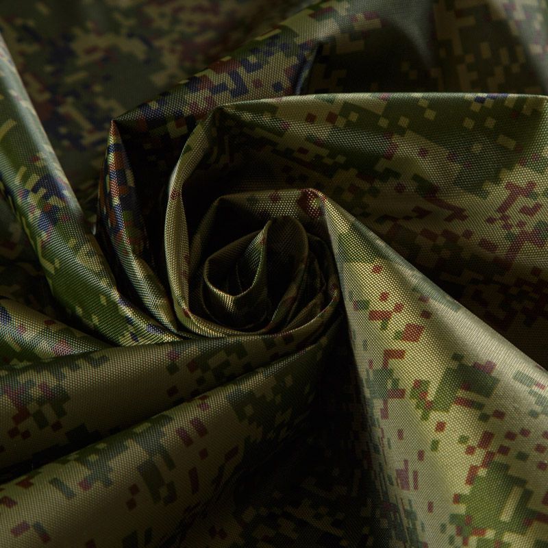 210 PU1000 Материал обладает влагонепроницаемостью, поверхность матовая, имеет мелкое полотняное переплетение. Хорошо держит форму, достаточно прочна. Используется для пошива курток, ветровок, плащей, утепленной одежды, одежды для собак, палаток, спальных мешков, а также для изготовления тентов для техники, штор, занавесок, сумок, тентов для садовых качелей. Принт кмф цифра.