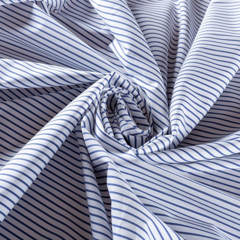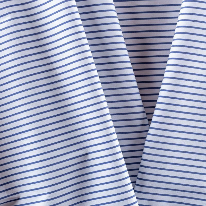 Итальянский плательно-рубашечный хлопок белого цвета в тонкую темно-синюю полоску. Ткань мягкая, лёгкая, непрозрачная, пластичная и приятная к телу, хорошо драпируется, имеет гладкую матовую поверхность и сатиновое плетение. Прекрасно подойдет как для пошива платья-рубашки, сарафана, платьев различных фасонов, туники, топа, летнего костюма, комбинезона.