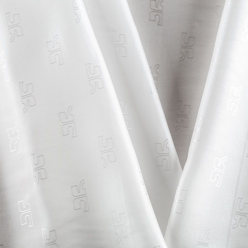 Итальянская подкладочная ткань из вискозы белого оттенка с жаккардовым геометрическим узором и красивым лоском. Полотно средней плотности, легкое, не просвечивает, хорошо скользит, не тянется. Подойдет для изготовления таких изделий, как пальто, костюмы, куртка, шуба, платье, жакет.