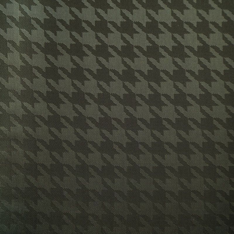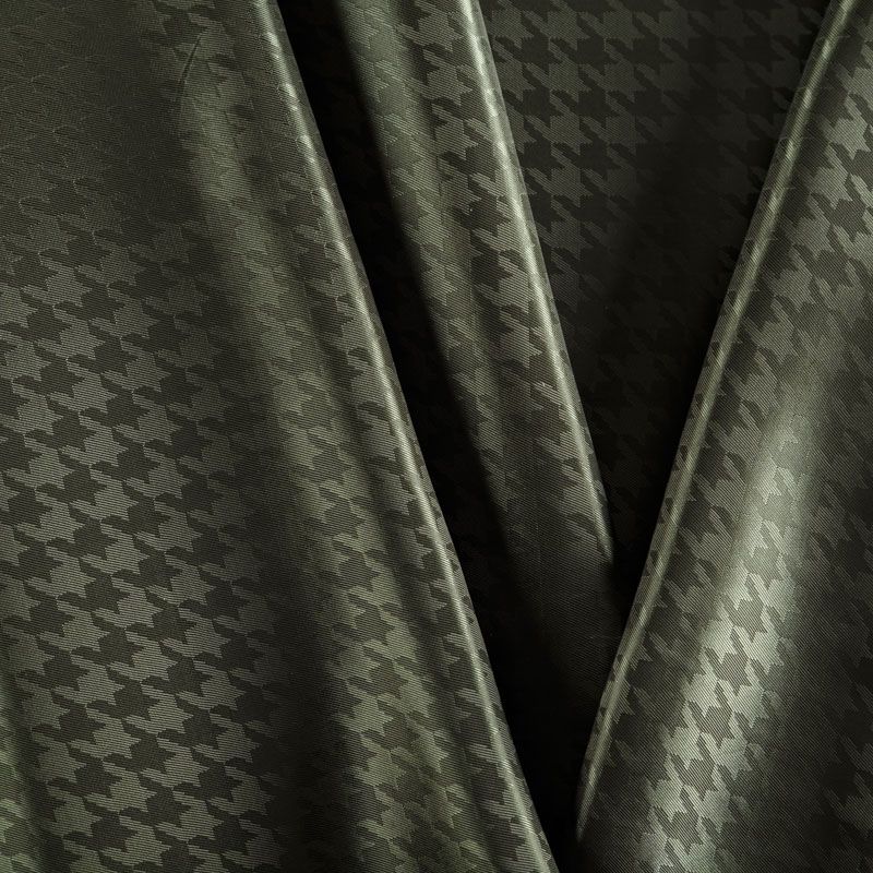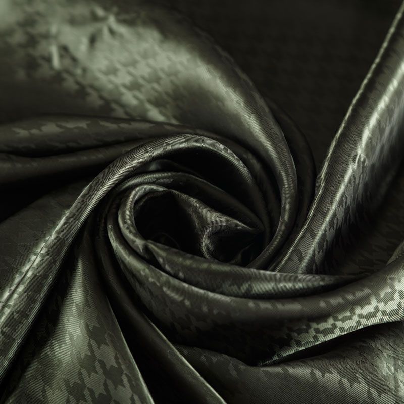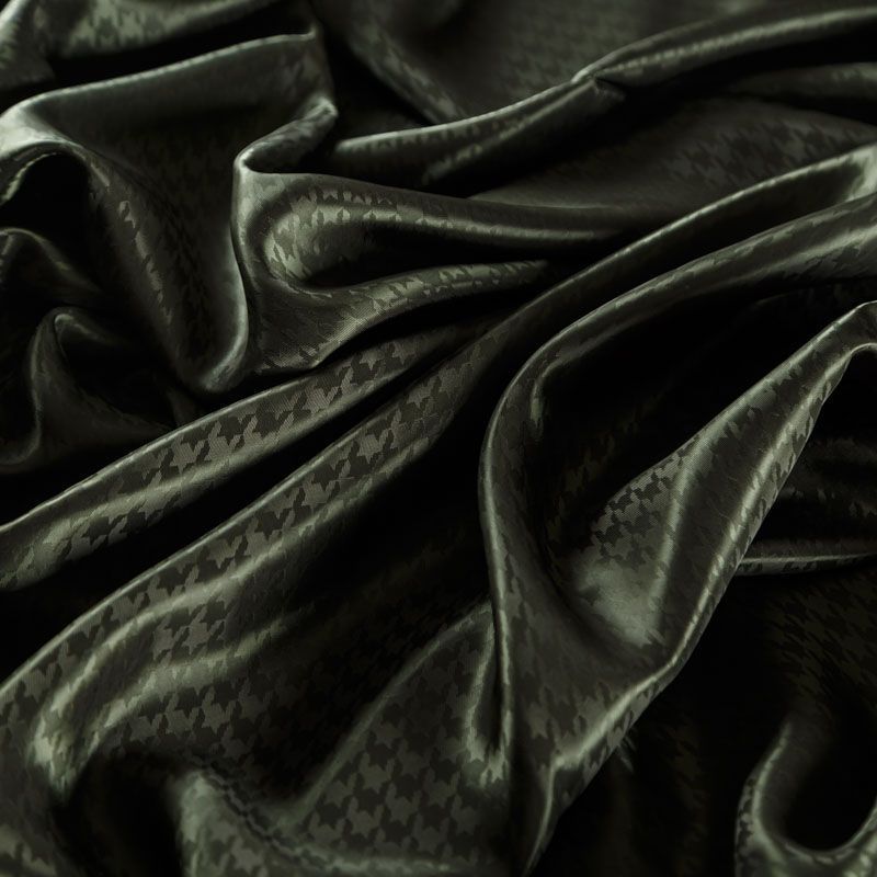 Итальянская подкладочная ткань из вискозы черного оттенка с жаккардовым узором "гусиная лапка" и красивым блеском. Полотно средней плотности, легкое, не просвечивает, хорошо скользит, не тянется. Подойдет для изготовления таких изделий, как пальто, костюмы, куртка, шуба, платье, жакет.