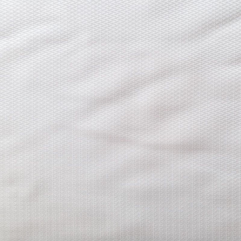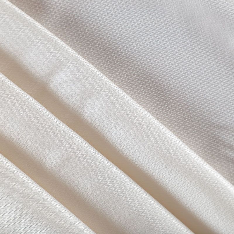 Смесовая подкладочная ткань молочного оттенка с жаккардовым геометрическим узором и красивым лоском. Полотно средней плотности, легкое, не просвечивает, хорошо скользит, не тянется. Подойдет для изготовления таких изделий, как пальто, костюмы, куртка, шуба, платье, жакет.