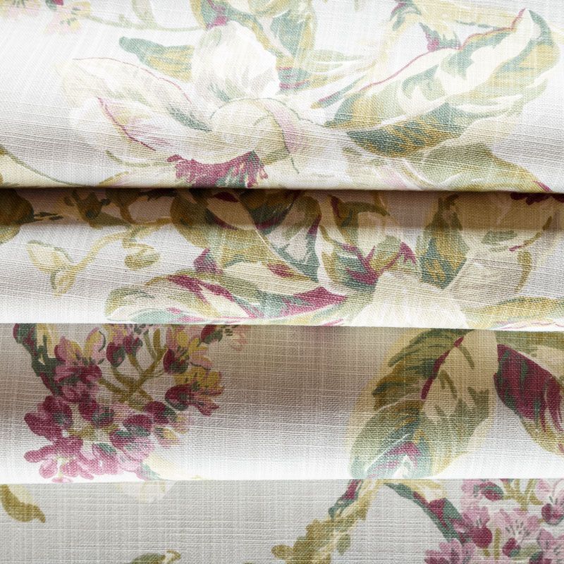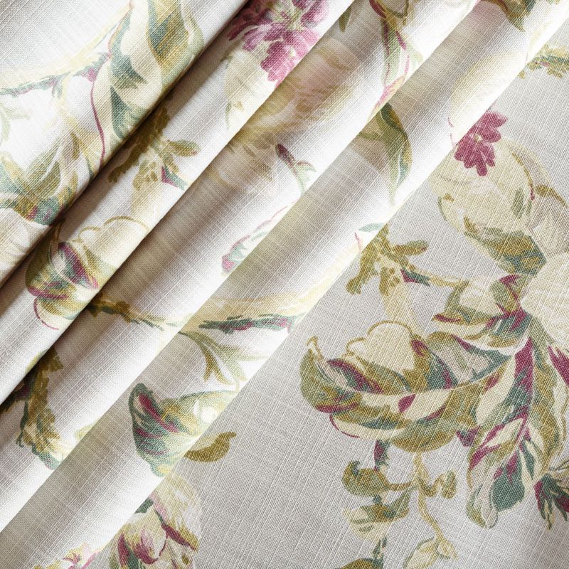 Хлопковая портьерная ткань с растительным принтом в розово-зеленых оттенках на светлом сером фоне. Ткань средней плотности, без блеска, хорошо драпируется, имеет полонтяное переплетение. Можно использовать для пошива портьер, римской шторы, салфеток, столового белья, подушек, покрывал и других предметов текстильного интерьера.
