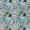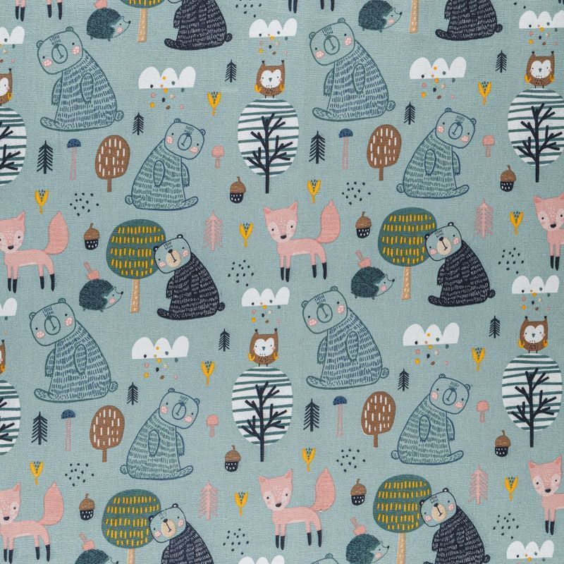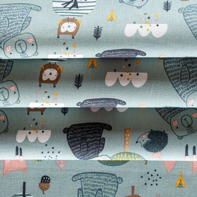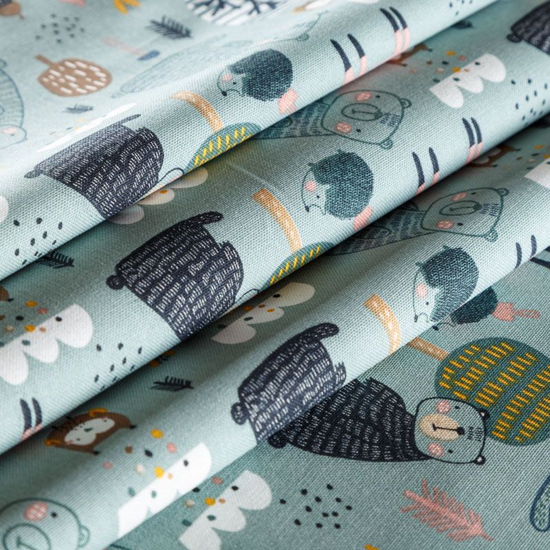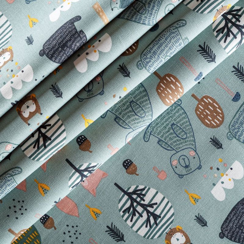 Матовая фактурная портьерная ткань зеленовато-голубого оттенка с забавными стилизованными лесными жителями. Ткань средней плотности, без блеска, хорошо драпируется, имеет полонтяное переплетение. Прекрасно впишется в самые разные стилевые направления (прованс, кантри). Можно использовать для пошива портьер, римской шторы, салфеток, столового белья, подушек, покрывал и других предметов текстильного интерьера.