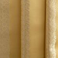 По своей структуре шелковые портьерные ткани являются мягким и красивым материалом, способным отражать свет. Изделия из шелка удивительно переливаются и блестят, придавая интерьеру помещения особую атмосферу и вид. Такие портьерные ткани лучше всего применять для создания покрывал, наволочек, штор, легких, воздушных и светлых – они отлично подойдут для затемненных мест либо закрытых окон. Шелковая ткань золотого оттенка с вертикальными полосками из мелких листиков прекрасно подойдет для помещений с невысоким потолком и широкими оконными проемами.