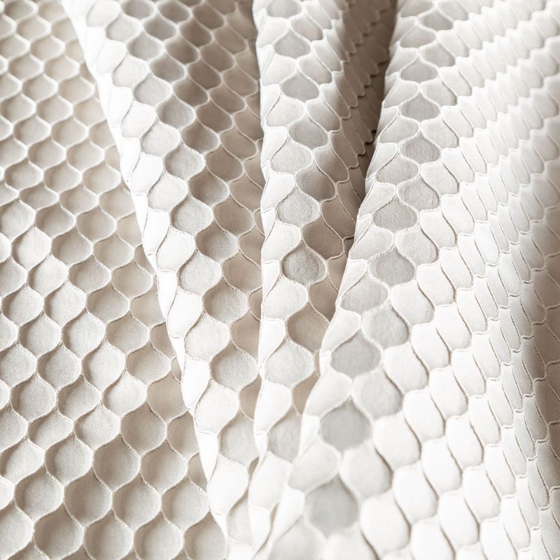 Стильная жаккардовая ткань из коллекции Неон известного бренда Fryett's с фактурной поверхностью, которая имитирует соты. Ткань средней плотности имеет сдержанный благородный блеск, прекрасно держит форму, драпируется в устойчивые складки. Подойдет для плотных штор, покрывал, подушек, скатертей, салфеток  и других элементов текстильного интерьера как в самостоятельном исполнении, так и качестве компаньона к цветным вариантам.