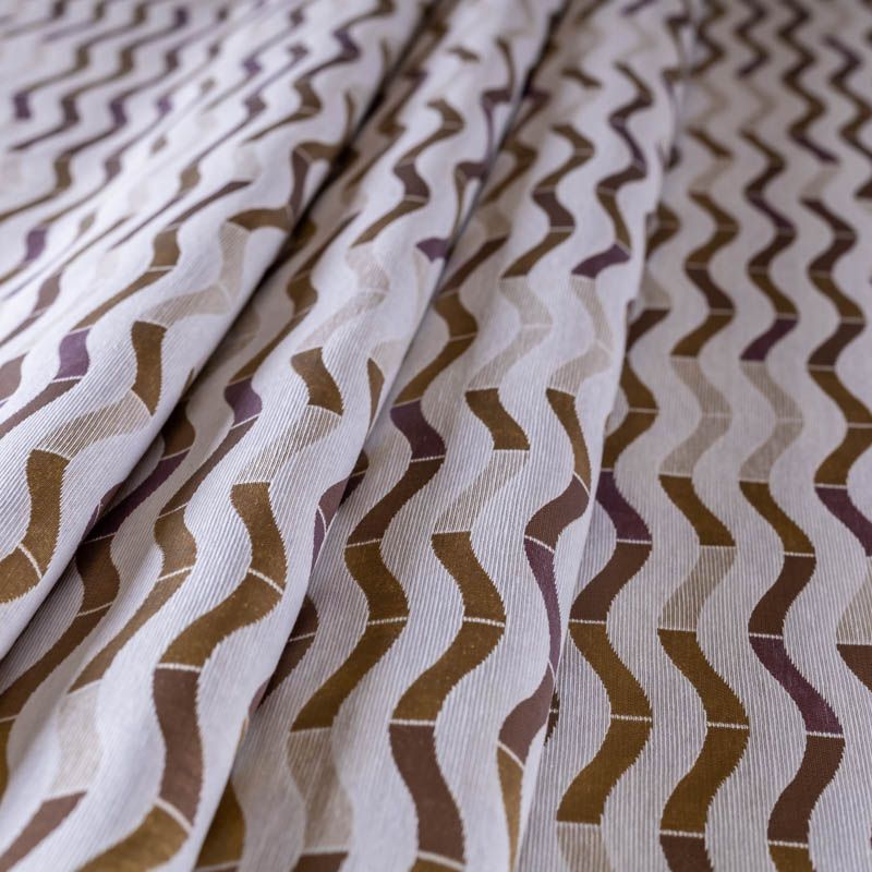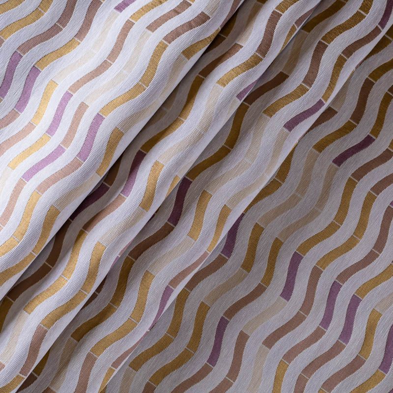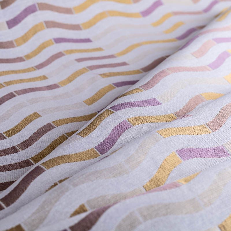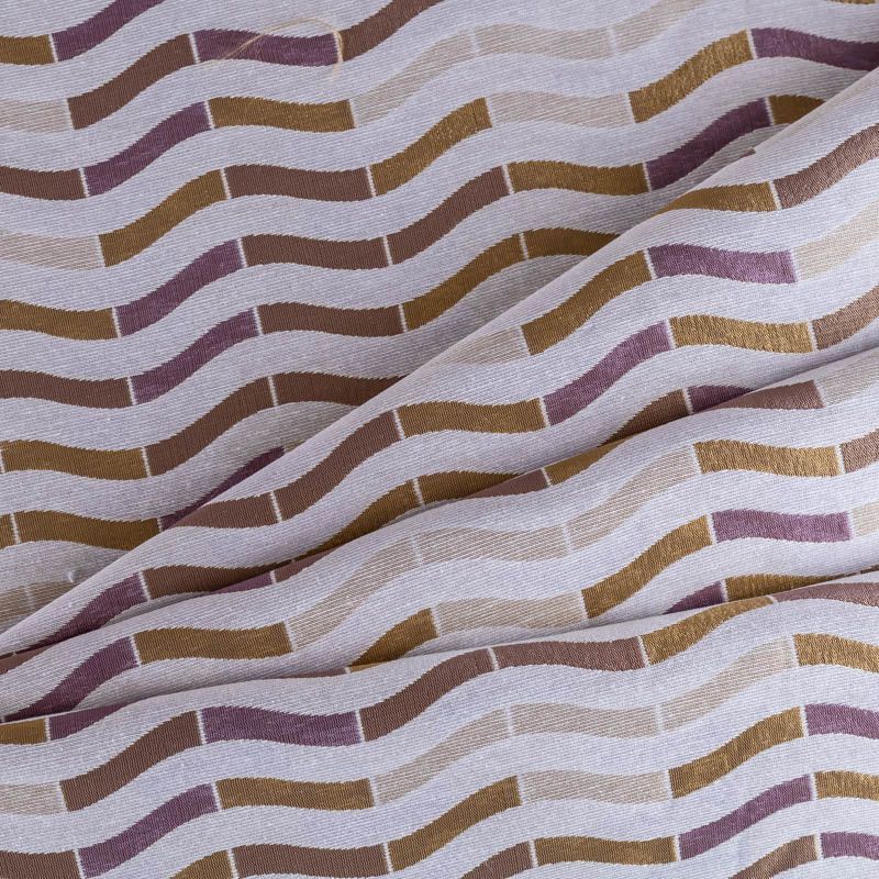 Итальянская жаккардовая фактурная портьерная ткань в благородной лилово-золотистой цветовой гамме с геометрическим рисунком. Вискоза с хлопком создают тяжелые складки при драпировке. Подходит для пошива штор, ламбрекенов, покрывал, наволочек, чехлов на мебель и других элементов декора.