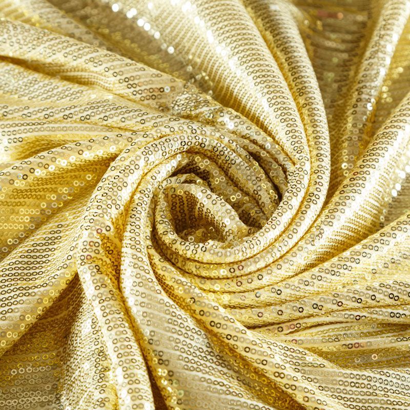 Блестящие пайетки оттенка светлого золота. Мелкие, размером около 3 мм. Основа - трикотажное полотно, комфортное в носке. Ткань не прозрачная, тянется.  Подойдет для вечернего коктельного платья или юбки, комбинезона, топа, танцевальных и сценических костюмов.