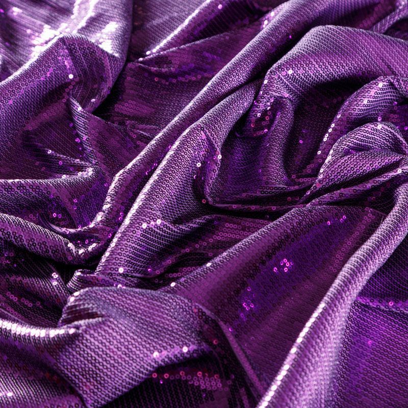 Блестящие пайетки насыщенного сиреневого оттенка. Мелкие, размером около 3 мм. Основа - трикотажное полотно, комфортное в носке. Ткань не прозрачная, тянется. Подойдет для вечернего коктельного платья или юбки, комбинезона, топа, танцевальных и сценических костюмов.