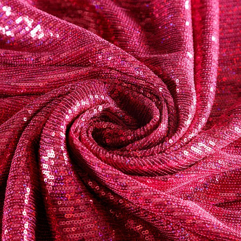 Эластичная сетка малинового оттенка по всей поверхности которой расположены глянцевые пайетки. Ткань очень хорошо драпируется, красиво переливается, имеет глянцевый блеск, пластичная, полоски расположены вдоль кромок, которые обработаны вышитым фигурным фестоном, набирается объемом,  Пайетки — идеальный материал для праздников и вечеринок. Из них получится эффектное платье, жакет, боди, туника, юбка или комбинезон.