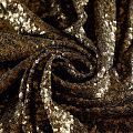 Мелкие пайетки бронзового оттенка на плотной сетчатой основе. Ткань хорошо драпируется, красиво переливается, имеет глянцевый блеск. Немного тянется, благодаря чему изделия получаются комфортными и отлично сидят по фигуре. Пайетки — идеальный материал для праздников и вечеринок. Из них получится эффектное платье, туника, юбка или комбинезон.