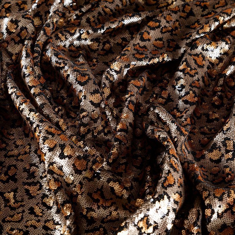 Пайетки с анималистическим узором в золотисто-черной гамме. Вышиты на черной эластичной сетке. Роскошно смотрится в блестящих нарядных комбинезонах, сверкающих платьях и искрящихся блузках, юбках, туниках, концертных костюмах, нарядах для танцев. На ощупь полотно не тяжелое, достаточно пластичное и удобное в носке.
