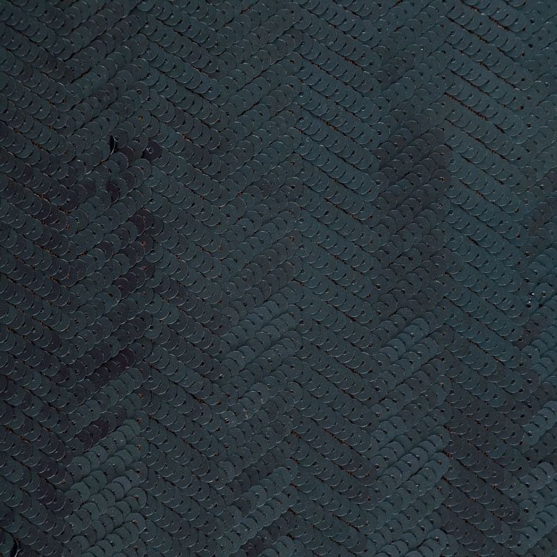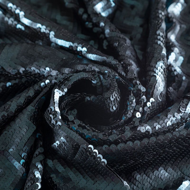 Двухсторонние пайетки на трикотажной сетчатой основе иссиня-черного оттенка образуют узор в виде полоски и елочки. Пайетки среднего размера, с умеренным блеском. Полотно мягкое и пластичное, хорошо тянется, благодаря этому изделия получаются удобными и великолепно садятся по фигуре. Отлично подойдет для пошива  вечерних нарядов, костюмов для концертных выступлений, а также для танцев и гимнастики.