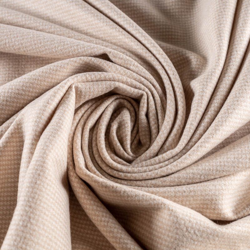 Трикотаж средней толщины, хорошо тянется. Мелкий ненавязчивый узор "гусиная лапка" образуется переплетением молочных и бежевых нитей. Ткань не сухая, мягкая, но плотная, не просвечивает, теплая, хорошо драпируется. Отлично подойдет для пошива легкой верхней одежды, жакетов, костюмов, юбок.