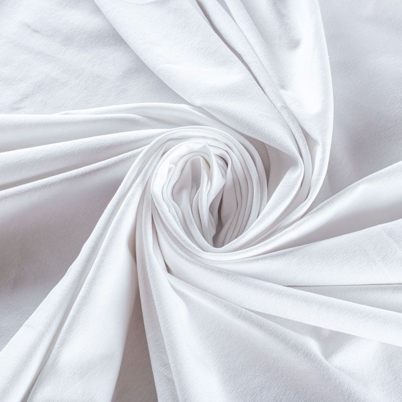 Гладкая трикотажная ткань, не теряет своей формы, практически не тянется в длину и хорошо растягивается в ширину. Добавление эластана к хлопковому волокну повышает износоустойчивость, формоустойчивость и эластичность ткани. Ткань великолепно смотрится как в свободном, так и в облегающем покрое одежды. Практичны и удобны свободные футболки с шортами или юбками, халаты, пижамы, сорочки, легкие, сарафаны, платья, туники.