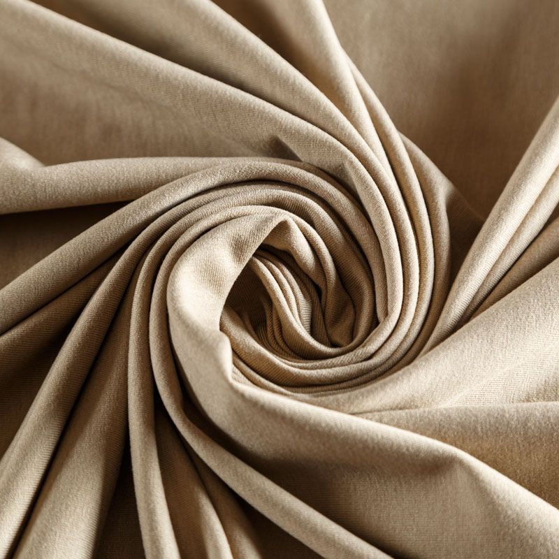 Смесовое трикотажное полотно с гладкой однородной поверхностью, которое особенно эффектно смотрится в драпировке. Материал средней плотности, не просвечивает, приятный к телу и комфортный в носке. Подойдет для пошива топов, футболок, бадлонов, лонгслива, кардигана, спортивного платья, джоггеров, шорт.