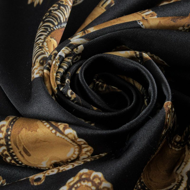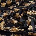 Итальянский трикотаж с принтом от известного бренда черного цвета с "золотой" бижутерией в виде сердец. Материал гладкий с лицевой и изнаночной сторон, мягкий и комфортный, достаточно эластичный, не мнется. Хорошо садится по фигуре, после растяжения быстро возвращается к прежней форме. Подойдет для пошива толстовки, спортивного костюма, джоггеров, шорт, свитшота, кроп-топа, платья в спортивном стиле и облегающего силуэта.
