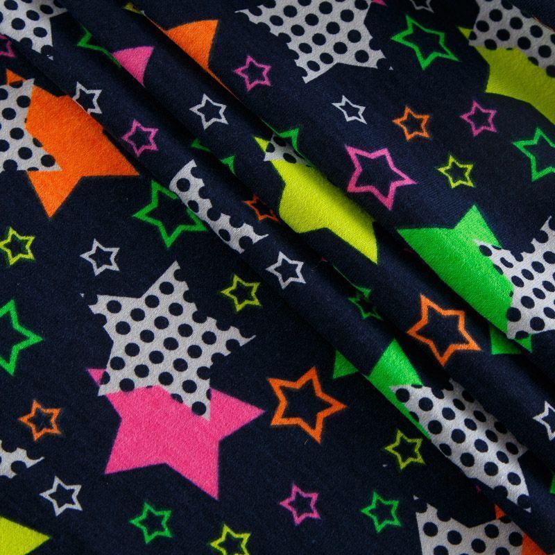 Мягкий трикотаж с ярким принтом на хлопковой основе с добавлением эластана. Полотно средней плотности, эластичное, достаточно пластичное, с лицевой, и с изнаночной стороны гладкая, приятная к телу. Кулирка отлично подходит для пошива нижнего белья, изделий для детей, а также для спортивной и домашней одежды, пижамы.
