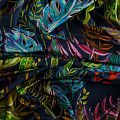 Итальянский мягкий хлопковый трикотаж черного цвета с ярким разноцветным тропическим принтом, гладкий, с красивым лоском. Материал очень приятный на ощупь, достаточно плотный, но при этом тонкий, просвечивает только при растяжении, сминается, но восстанавливется. Отлично тянется за счет плетения и содержания эластана. Отлично подойдет для пошива летних костюмов, топов, майки, футболки, платья, домашней одежды.